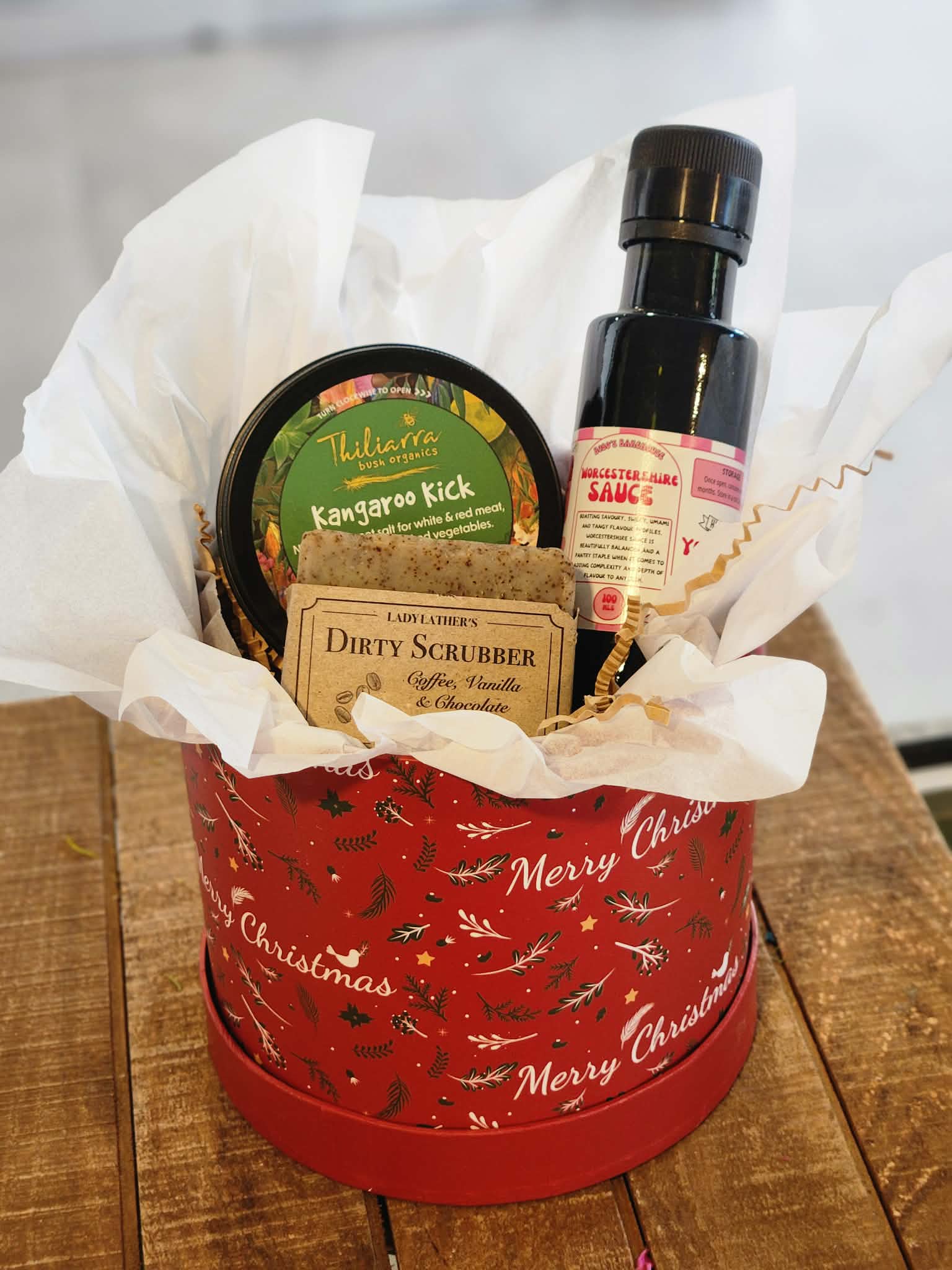 Our Christmas Entertainer Hat Box is the perfect festive gift for those who love good food and a touch of something special. Beautifully presented in a Christmas hat box, it includes a locally made soap, gourmet Worcestershire sauce, and a flavour-packed salt rub — ideal for summer barbecues, entertaining, or easy Christmas gifting.