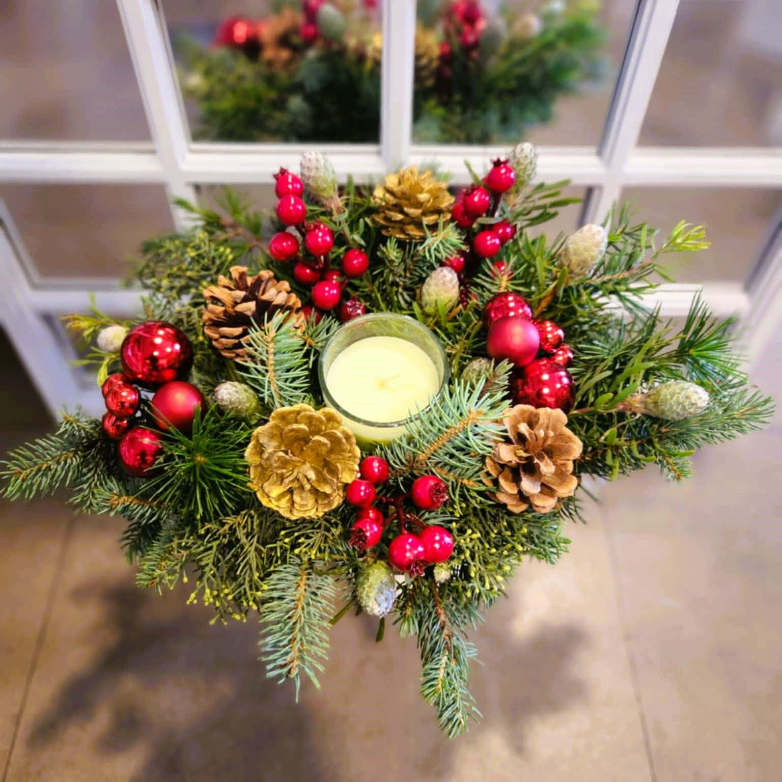 Transform your festive table with our Christmas Table Centre Pieces, expertly curated to elevate your holiday gatherings. Each arrangement features seasonal florals and foliage paired with a locally-crafted candle, creating a warm, inviting focal point for your dining experience. The combination of fresh blooms and ambient candlelight establishes an elegant atmosphere perfect for Christmas celebrations. Ideal for both intimate dinners and larger entertaining, these centre pieces bring sophisticated seasonal charm to any table setting.