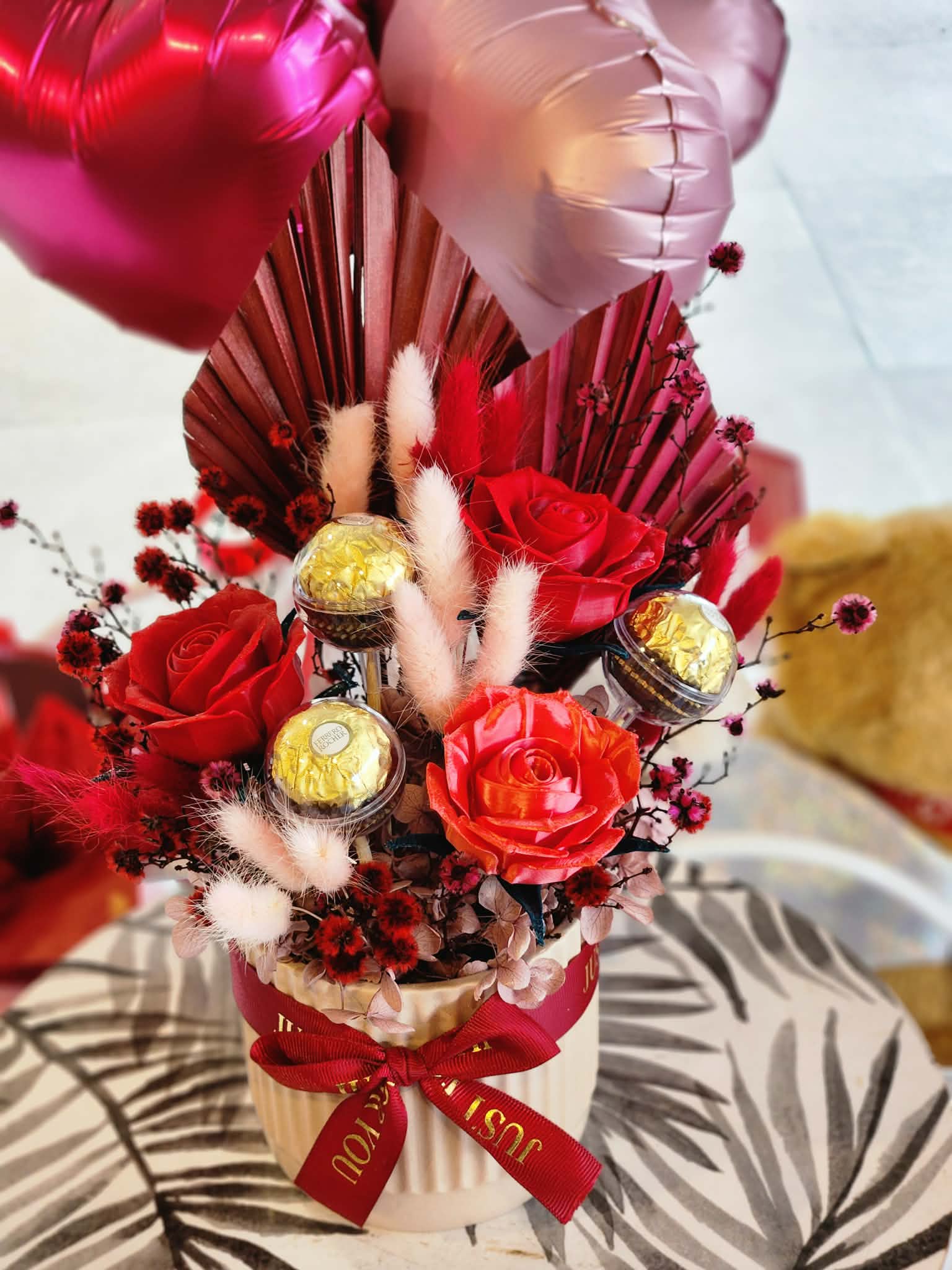 A keepsake arrangement designed to last, featuring stunning 3D printed roses nestled among preserved textures and indulgent Ferrero Rocher chocolates. Elegant, romantic and a little bit extra — just like love should be.