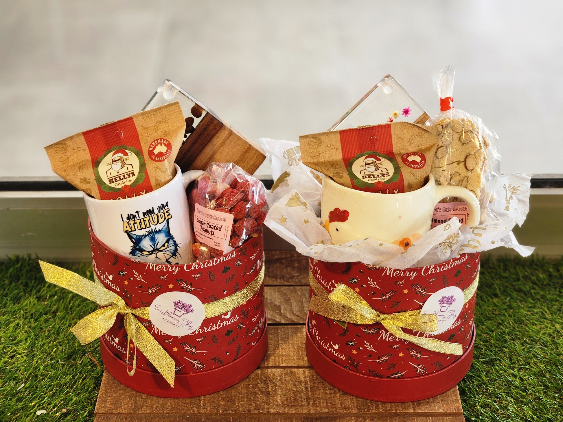 Includes a coffee mug, handcrafted timber and resin coaster, lollies, and locally made sugar-coated peanuts or almond bread. Perfect for Secret Santa, teachers or Christmas gifting.