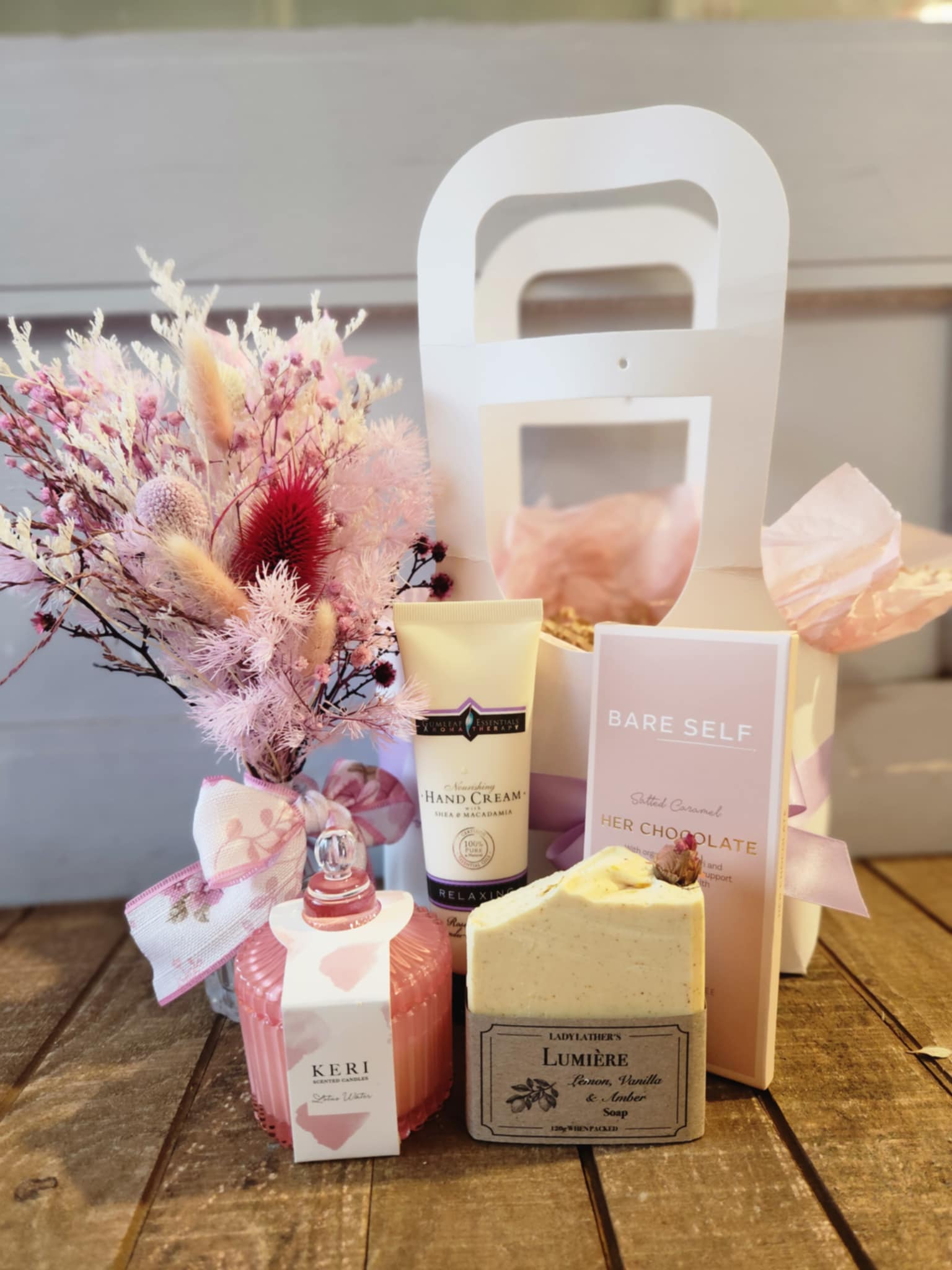Pamper someone special with our thoughtfully curated Sweet Serenity bag, designed to transform her day into a rejuvenating retreat. This beautiful gift features a delicate dried flower arrangement that brings lasting natural beauty, luxurious locally handcrafted soap and nourishing hand cream for skin-loving indulgence, premium chocolates for a moment of sweet pleasure, and an aromatic candle to create a peaceful atmosphere—all elegantly presented in a keepsake bag.